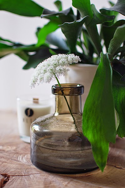 Mój pomysł na stylistykę był prosty - kwiatów i zieleni w ogrodzie mamy dużo, chciałam więc, żeby stół był w stonowanych, neutralnych kolorach. Biały stół, ciemna zastawa, szare podkładki - na zielonym tle taki wybór wg. mnie okazał się strzałem w 10. Jest kontrastowo, ale nie krzykliwie. Stół udekorowany został pięknymi przedmiotami z