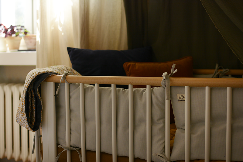 Lubię te kąty. Lubię mocne kolory które się tutaj przenikają. Słoneczne żółcie, morskie zielenie, ciemna szarość... I pomyśleć, że chciałam kiedyś na wskroś surowej stylizacji dziecięcej przestrzeni. No ale... nie potrafię tak. Lubię soczyście i po naszemu. Koszyczki z Lilu genialnie sprawdzają się i tutaj. W jednym mieszkają Mailegowe myszki a w drugim drewniany fotograficzny aparat, po który T. sięga jak tylko widzi, że ja robię zdjęcia.